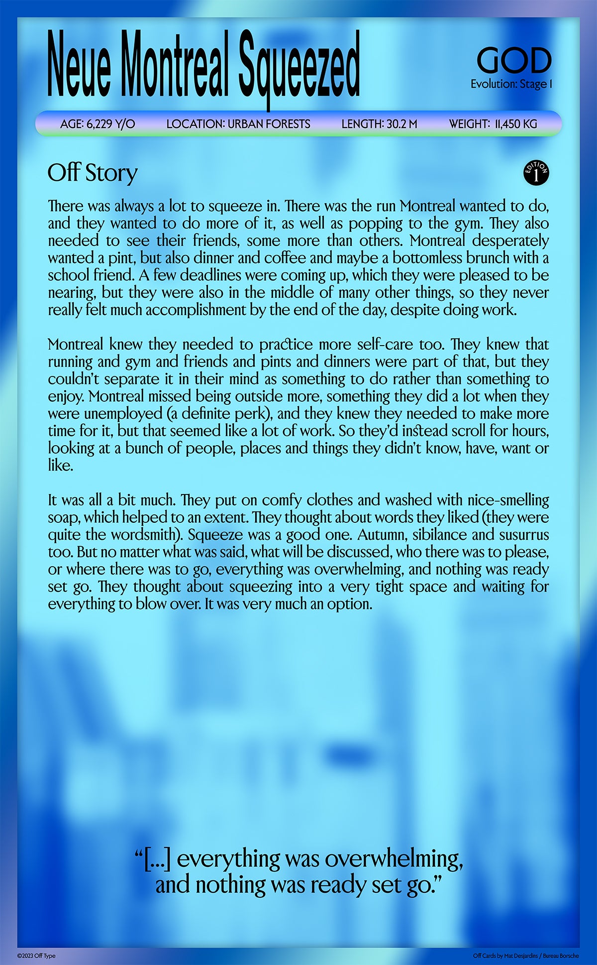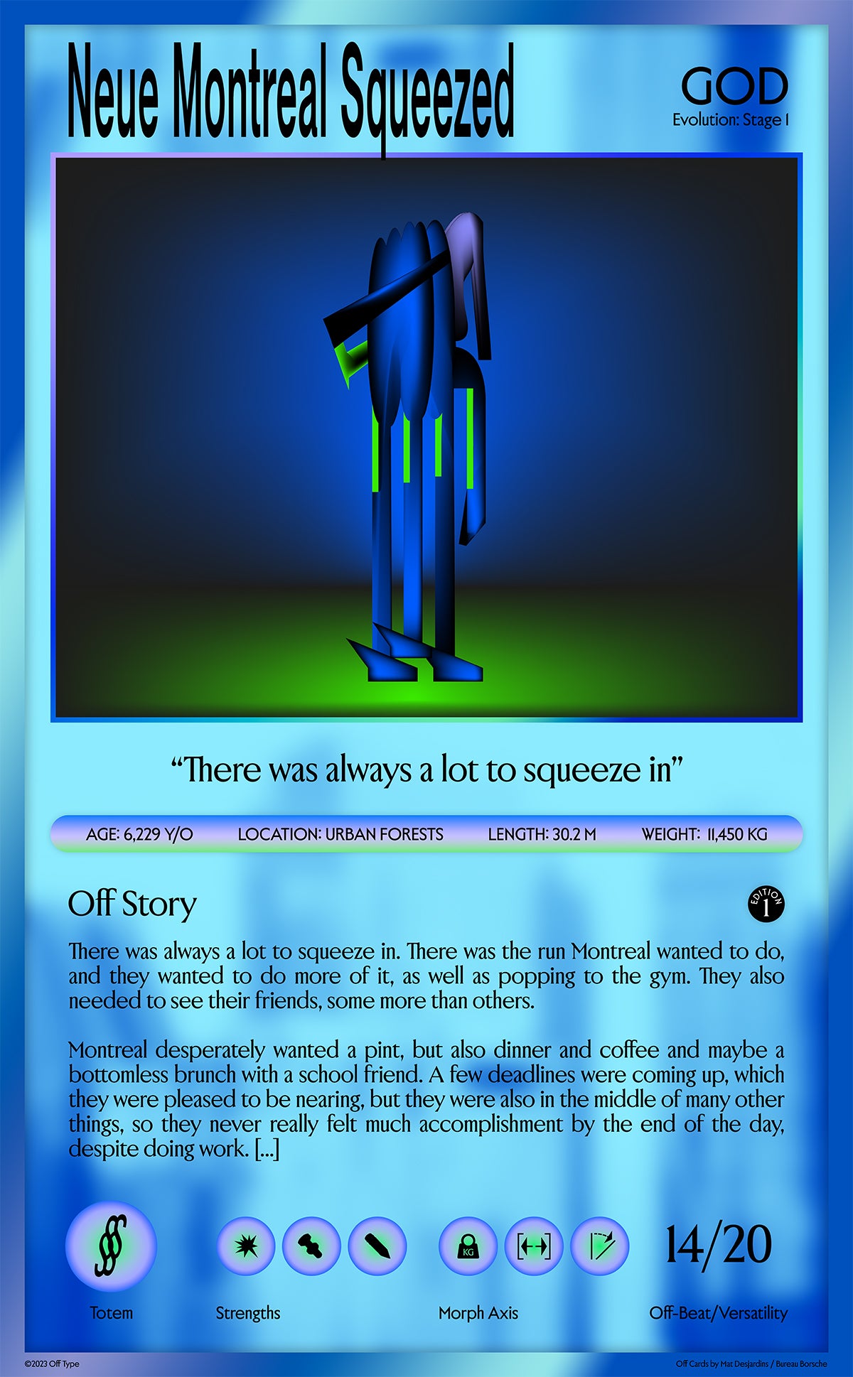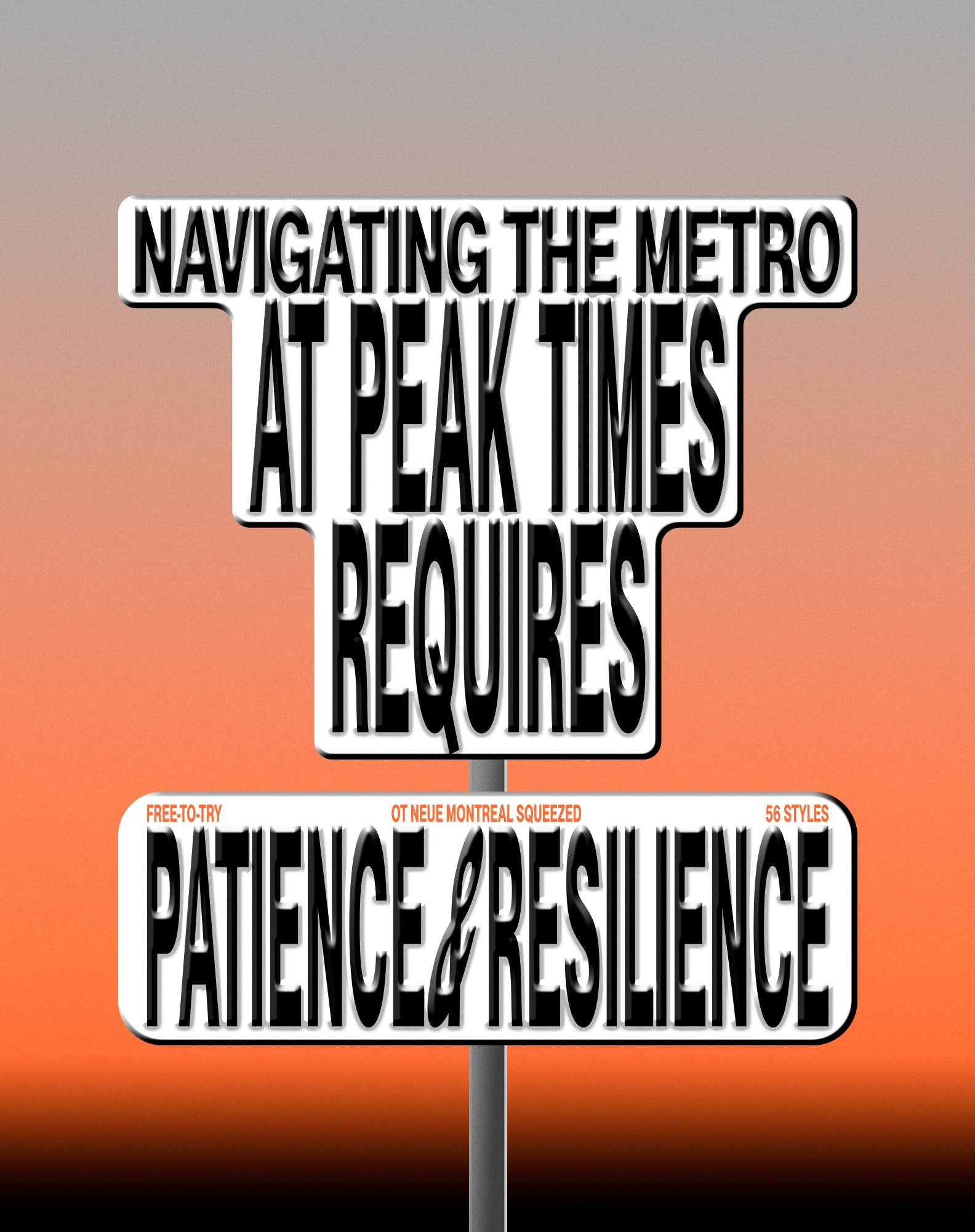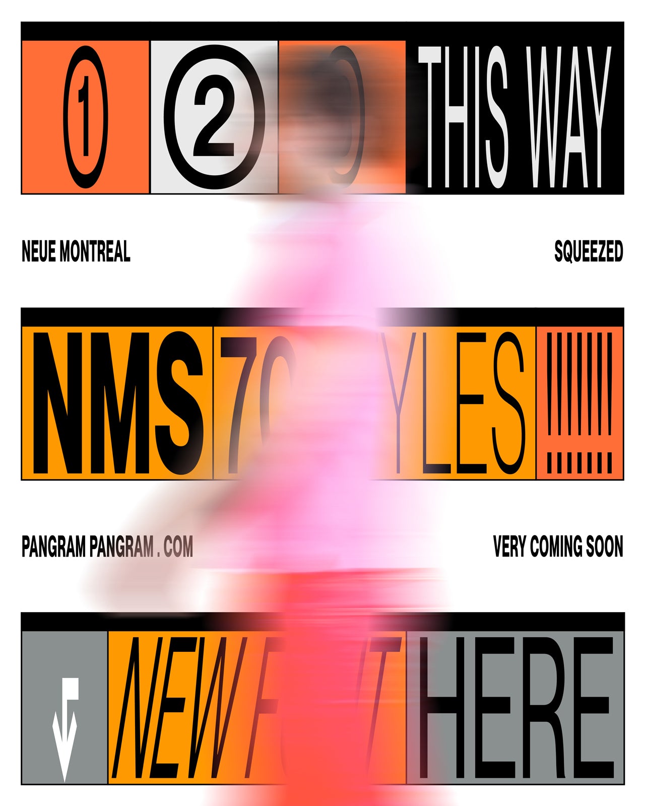 Using the incredibly popular, hard-working, timeless workhorse, city-inspired, Grotesque sans serif Neue Montreal as its basis, its stretched counterpart is just as hard working. It just looks a bit different, is all. Trend-ready, freshly squeezed.