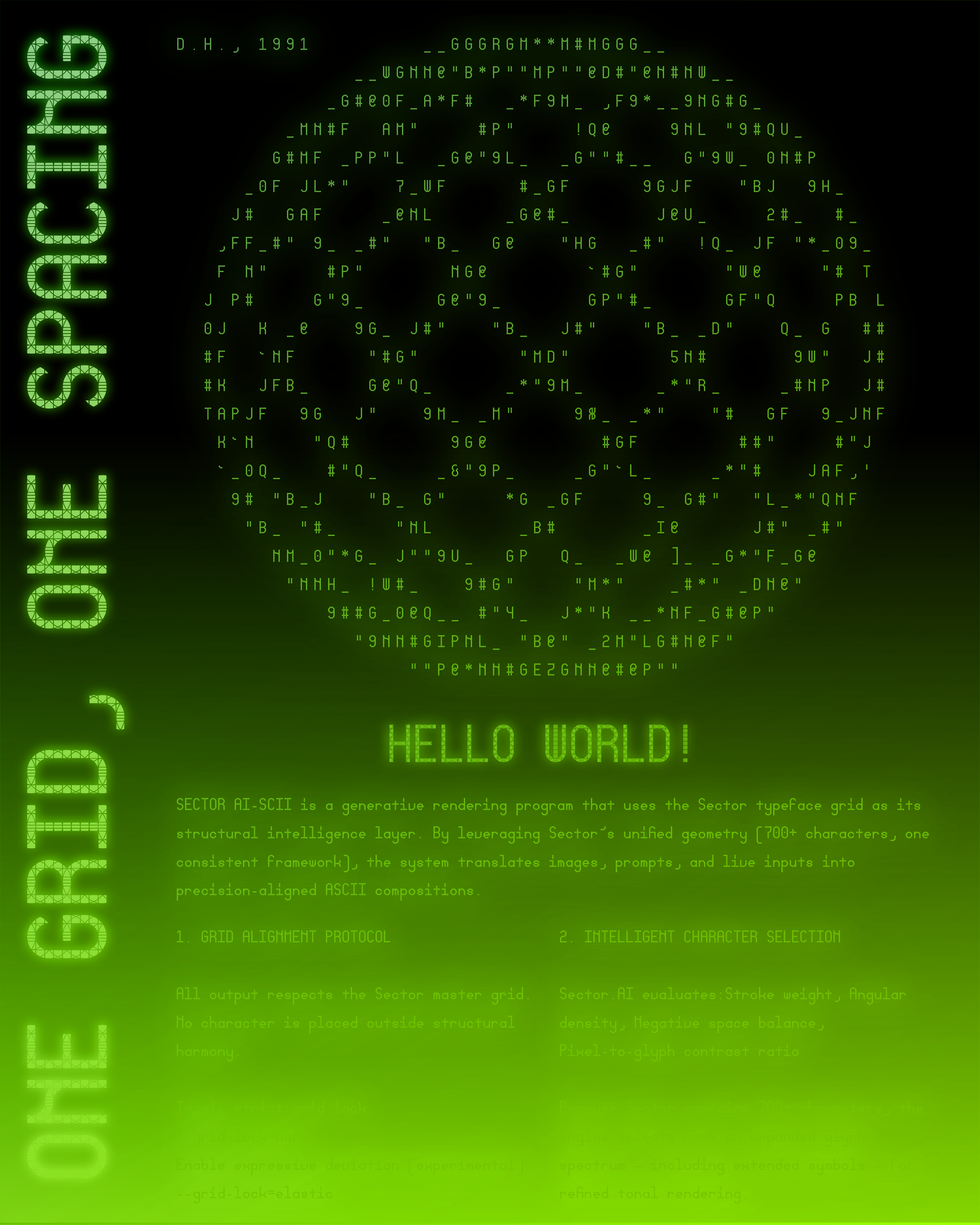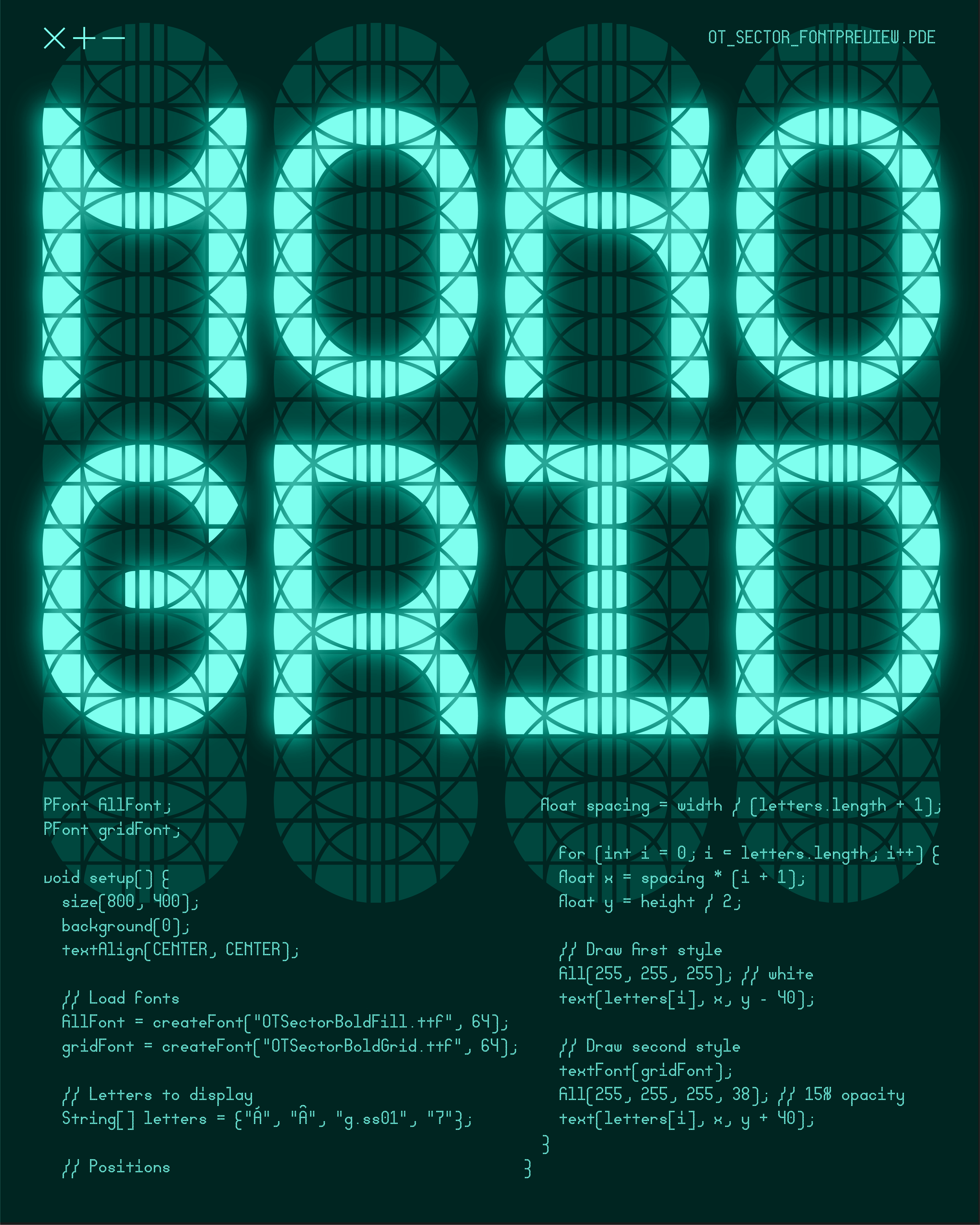 Ask any designer and theyβll likely tell you creativity doesnβt start with freedom, but rather with limitations. Built on a single, fixed grid, an uncompromising framework designed to hold an entire typeface, Sector is the product of such an extremely restrictive design process: inspired by the logic of retro LCD displays, where simple segmented systems can express remarkably complex alphabets, this typeface is able to represent 700 glyphs, including diacritics, small caps, alternates, ligatures, fractions and more features with a single grid module, making it the most versatile and adaptable font in its admittedly narrow genre.